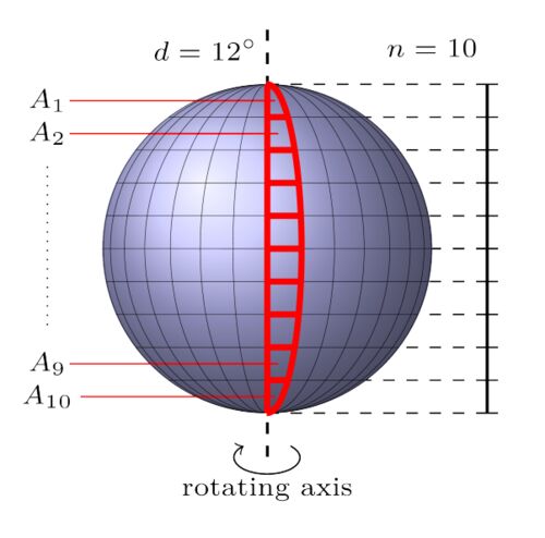 問題. Waterworld 下図のように表面が分割された球が与えられる。水平方向には高さが等しくなるように 分割されており、垂直方向には 等分されている。 ステップ目のときの領域 の表面積に占める水の量の割合をパーセント表記したものを とする。 球全体の表…